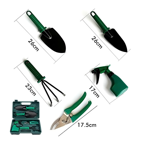1 x Комплект градински инструменти с кутия за съхранение: 1 x нокът/гребло за плевене, 2 x лопатки за засаждане, 1 x ножица за подрязване, 1 x пулверизатор.