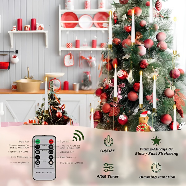 С 10-бутонно дистанционно управление можете да регулирате яркостта на свещите, да избирате между четири режима на осветление и да задавате таймер за 4 или 6 часа, осигурявайки удобство и гъвкавост при декорацията.