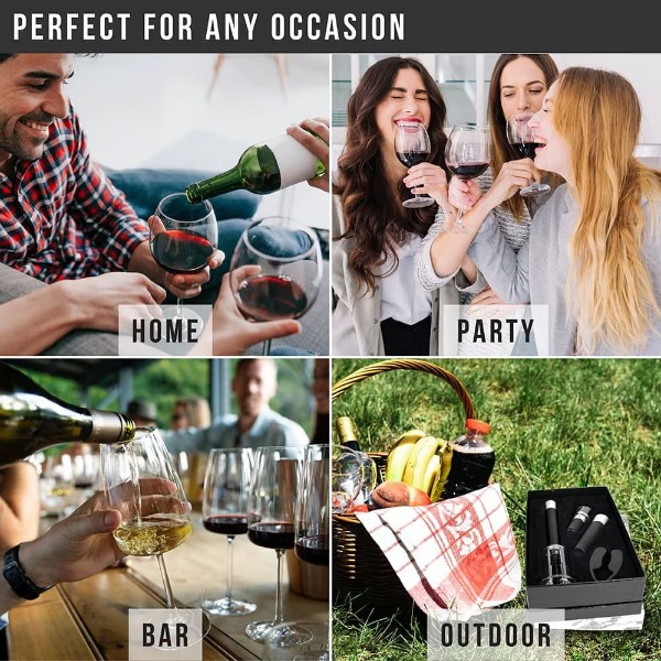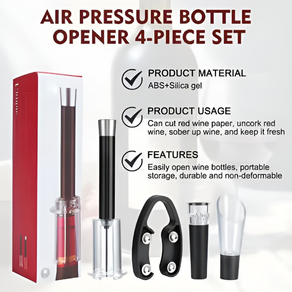 Този комплект 4-в-1 включва отварачка с въздушна помпа, нож за фолио, аератор за наливане и вакуумна тапа за безупречно винено изживяване.
