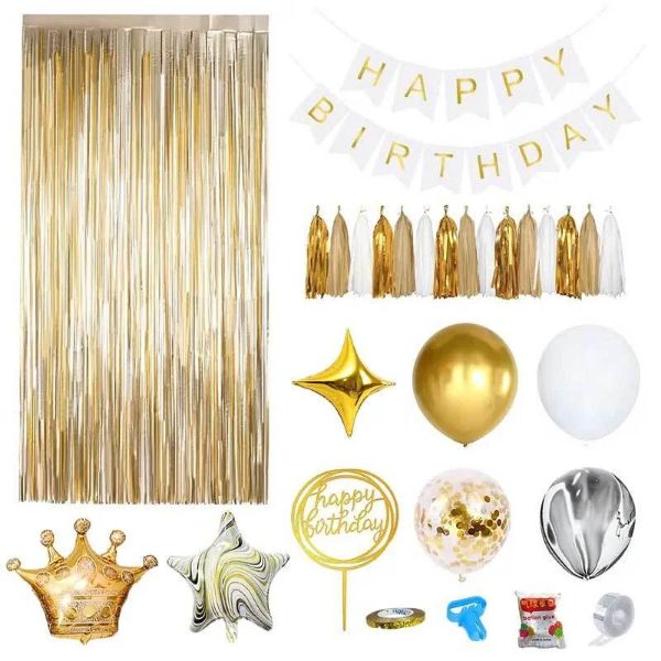 60 балона в различни цветове; 1x балон с форма на корона; 2x балона с форма на петолъчна звезда; 2x балона с форма на четирилъчна звезда; 1x завеса от блестящи панделки; 1x банер „Честит рожден ден“; 5x комплект цветни декоративни пискюли; 1x декорация за торта „Честит рожден ден“; декоративна панделка, аксесоари за връзване на балони, лепило и лента за закрепване на балони.