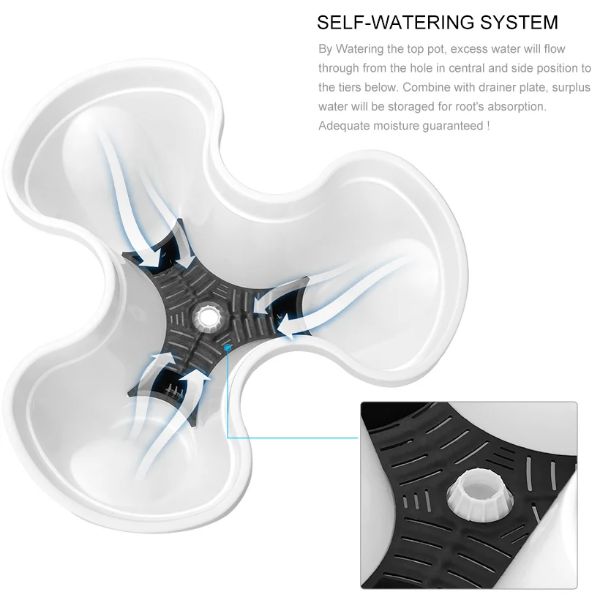 • СИСТЕМА ЗА САМОНАПОЯВАНЕ: Във всяко отделение на саксиите има вграден резервоар за поливане, отвеждащ водата надолу. Дизайнът с дренаж позволява на водата да се стича надолу към долния етаж, докато накрая се събере в чинийката на дъното. Така ще поддържате растенията здрави и ще избегнете загниване на корените.